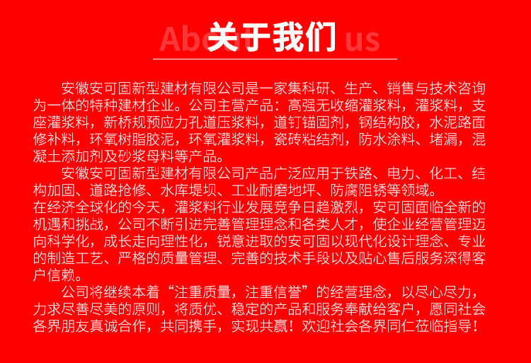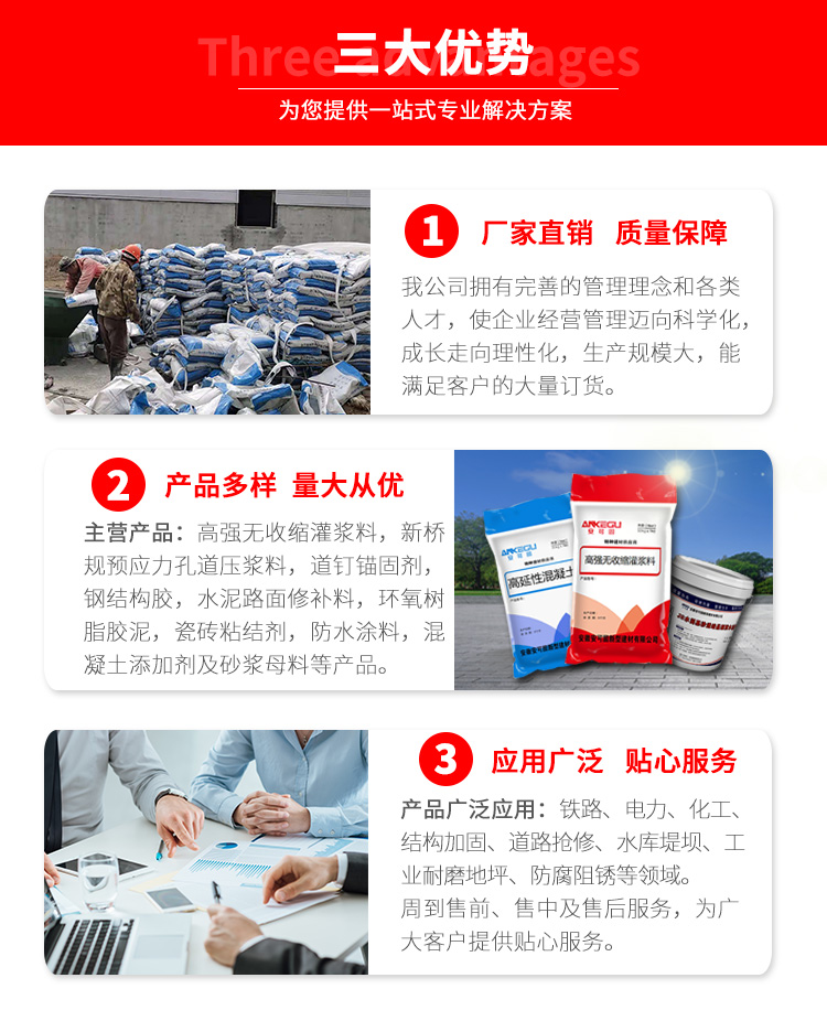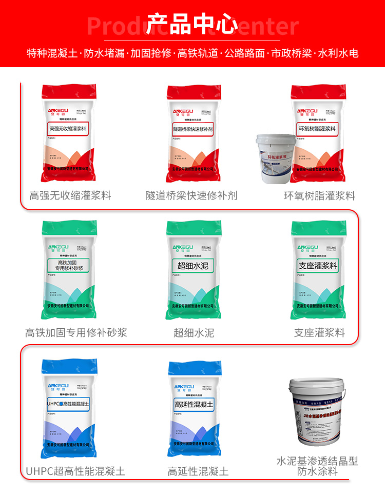 高強(qiáng)無(wú)收縮灌漿料,灌漿料,支座灌漿料,新橋規(guī)預(yù)應(yīng)力孔道壓漿料,道釘錨固劑,鋼結(jié)構(gòu)膠,水泥路面修補(bǔ)料,環(huán)氧樹(shù)脂膠泥,環(huán)氧灌漿料,瓷磚粘結(jié)劑,防水涂料、堵漏,混凝土添加劑及砂漿母料等產(chǎn)品。